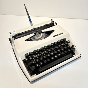 Superleuke compacte witte typemachine met een heerlijk soepele aanslag. Daar staan Duitse typemachines ook om bekend: je kunt lekker doortypen op deze machines. Zoals je wel vaker ziet bij een portable typemachine ‘ontbreekt’ het uitroepteken. Er moest een keuze worden gemaakt in de tekens vandaar dat de ! dan sneuvelde. Een uitroepteken maak je door een . te typen, terugtoets, en dan een hoog streepje ‘, waardoor je een ! krijgt. Verder is deze typemachine compleet met alle cijfers (ook de 1 is niet standaard op portables) en de ij en f van florijn voor het guldenteken. Omdat deze machine een plastic body heeft, zie je wel wat gebruikssporen, check de foto’s goed! Het valt gelukkig niet heel erg op, maar fijn om te weten natuurlijk. Deze typemachine heeft een mooi groot en daarmee duidelijk lettertype. Kortom: een goede keuze als je lekker wil gaan typen.